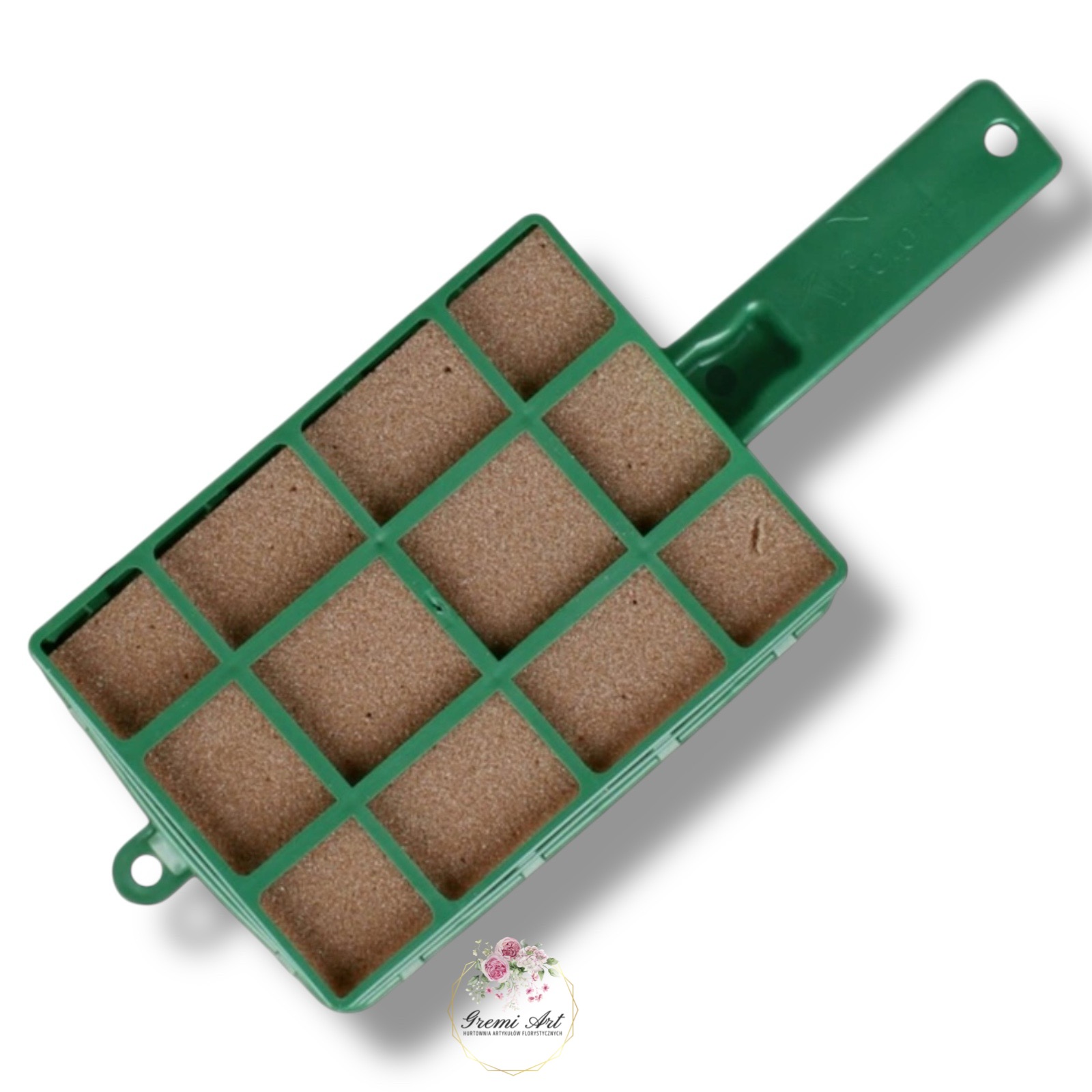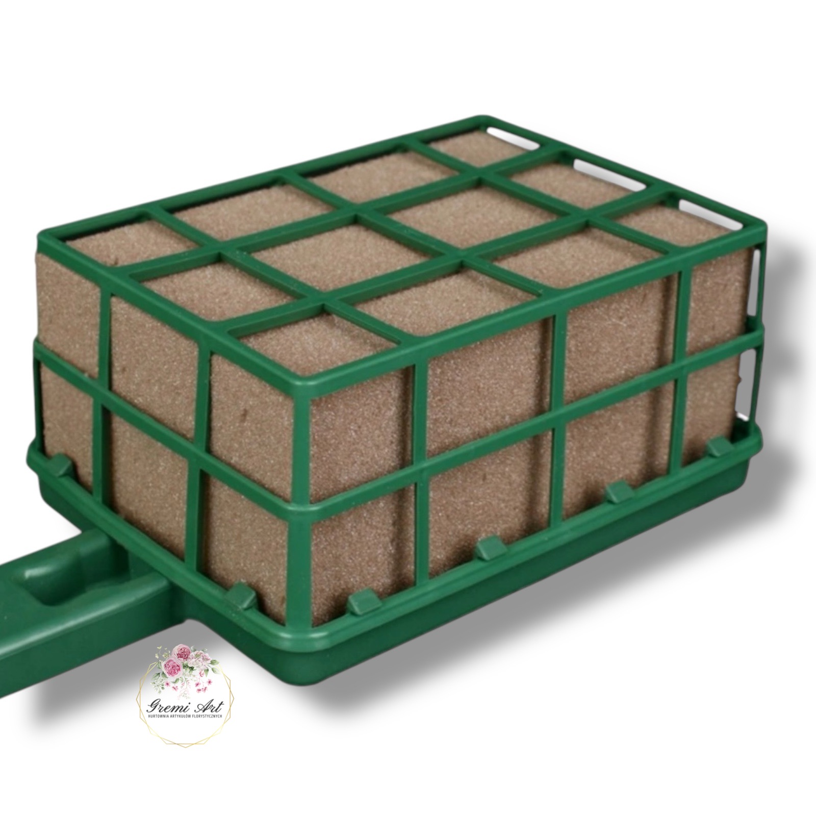 Sucha gąbka florystyczna, przeznaczona do tworzenia kompozycji ze sztucznych kwiatów, umieszczona w plastikowym stelażu, na podstawce, z rączką.