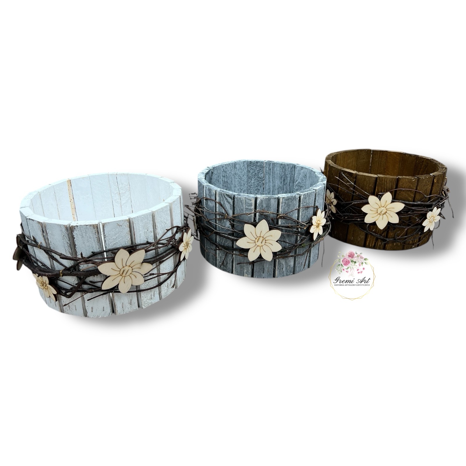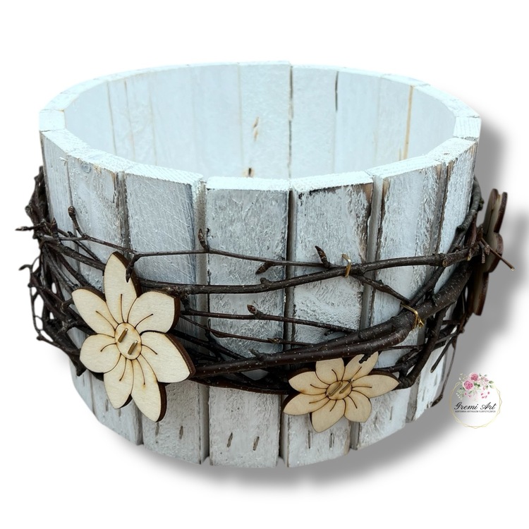 31,00 zł - detalDrewniana osłonka otulona gałązkami brzozy z ozdobnymi kwiatuszkami do własnej aranżacji. Piękna baza pod kompozycje, stroiki z kwiatów sztucznych, a także żywych. Nie wszystkie produkty drewniane są szlifowane aby zachowały wygląd naturalny. Celowe przecieranie, postarzanie drewna dodaje mu uroku, jest to celowy zabieg. Produkty wykonane z drzewa lub sklejki mogą posiadać sęki, rysy lub pęknięcia i jest to efekt naturalny. Nie stanowi to podstawy do reklamacji.