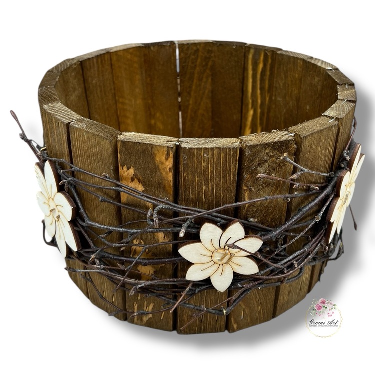 Drewniana osłonka otulona gałązkami brzozy z ozdobnymi kwiatuszkami do własnej aranżacji. Piękna baza pod kompozycje, stroiki z kwiatów sztucznych, a także żywych. Nie wszystkie produkty drewniane są szlifowane aby zachowały wygląd naturalny. Celowe przecieranie, postarzanie drewna dodaje mu uroku, jest to celowy zabieg. Produkty wykonane z drzewa lub sklejki mogą posiadać sęki, rysy lub pęknięcia i jest to efekt naturalny. Nie stanowi to podstawy do reklamacji.