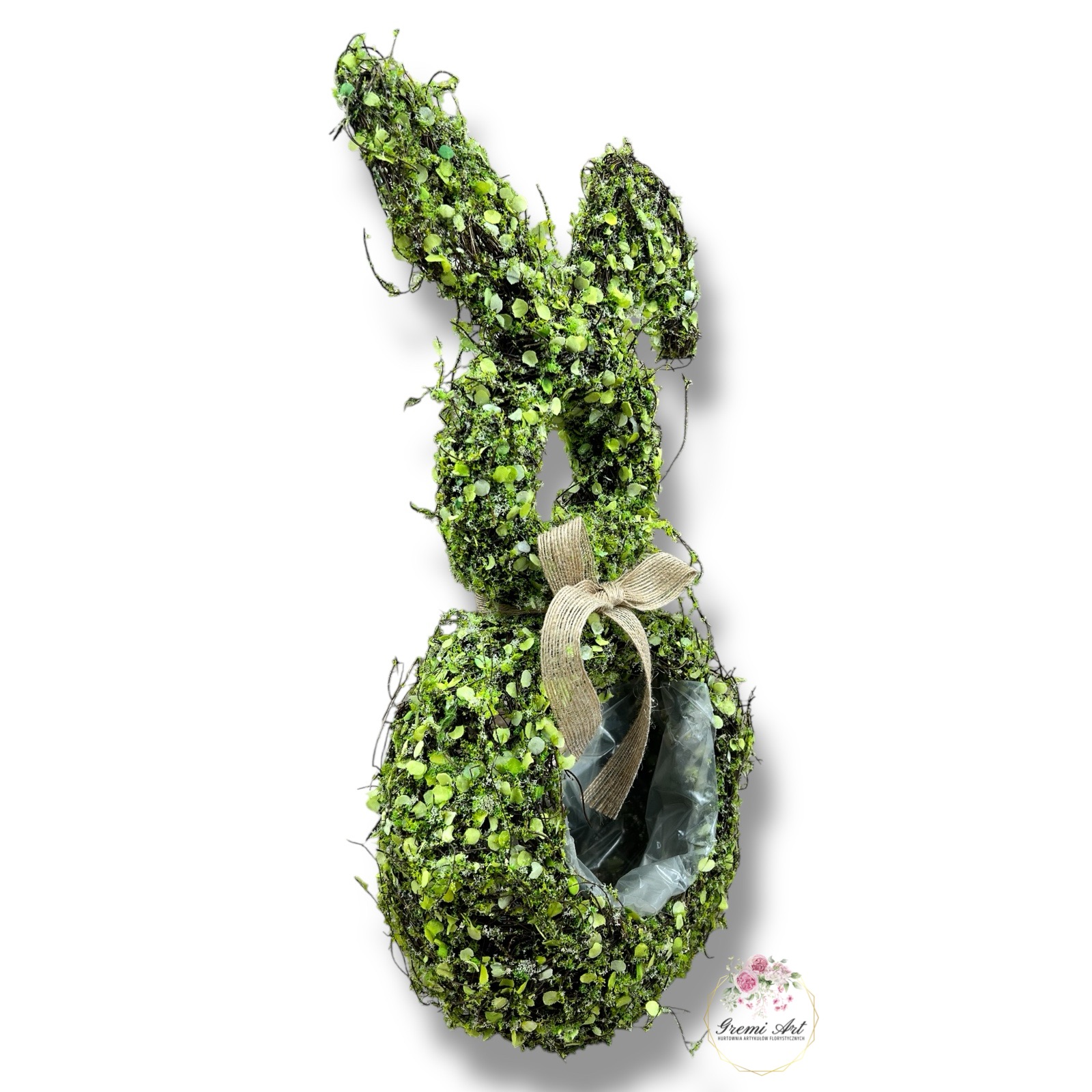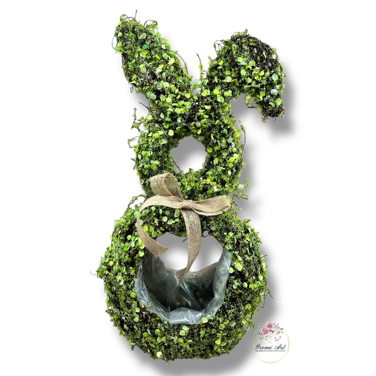 35,00 zł - detalPiękna osłonka w kształcie zajączka wykonana z faszyny, ozdobionej mchem do własnej aranżacji. Idealna baza pod kompozycje, stroiki z kwiatów sztucznych, a także żywych. Wyłożona w środku folią zabezpieczającą.