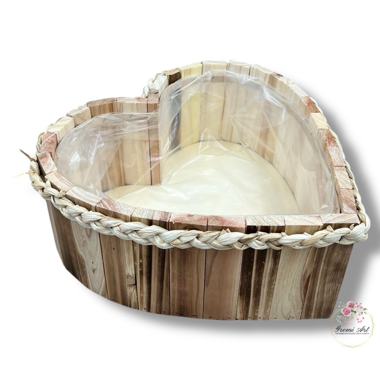 27,00 zł - detalDrewniana osłonka w kształcie serca z ozdobnym, plecionym sznurkiem do własnej aranżacji. Piękna baza pod kompozycje, stroiki z kwiatów sztucznych, a także żywych. Wyłożona w środku folią zabezpieczającą. Produkty wykonane z drzewa lub sklejki mogą posiadać sęki, rysy lub pęknięcia i jest to efekt naturalny. Nie stanowi to podstawy do reklamacji.
