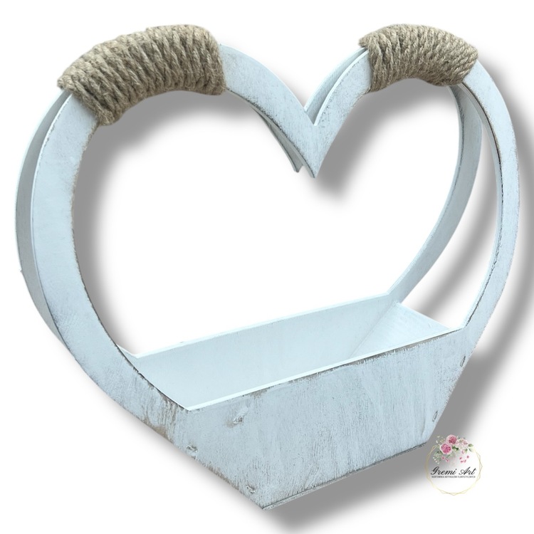 37,00 zł - detalDrewniany kosz w kształcie serca do własnej aranżacji, ozdobiony sznurkiem jutowym. Piękna baza pod kompozycje, stroiki z kwiatów sztucznych, a także żywych. Nie wszystkie produkty drewniane są szlifowane aby zachowały wygląd naturalny. Celowe przecieranie, postarzanie drewna dodaje mu uroku. Produkty wykonane z drzewa lub sklejki mogą posiadać sęki, rysy lub pęknięcia.